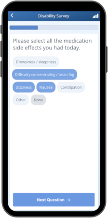 - Charts & calendars visualize life impacts like time resting, missed work, medication side effects and social isolation.