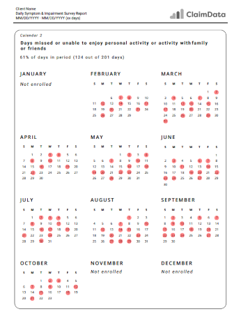 - Hard-to-capture impacts to quality of life become clear through charts, tables & calendars — trial-ready exhibits that quantify & convey instantly clients' real experiences.
